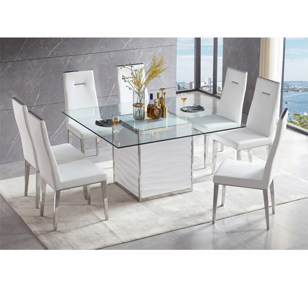 Material | Table :Glass top,base: SS frame insert white PU wave board Chair:SS, High density foam , PU |